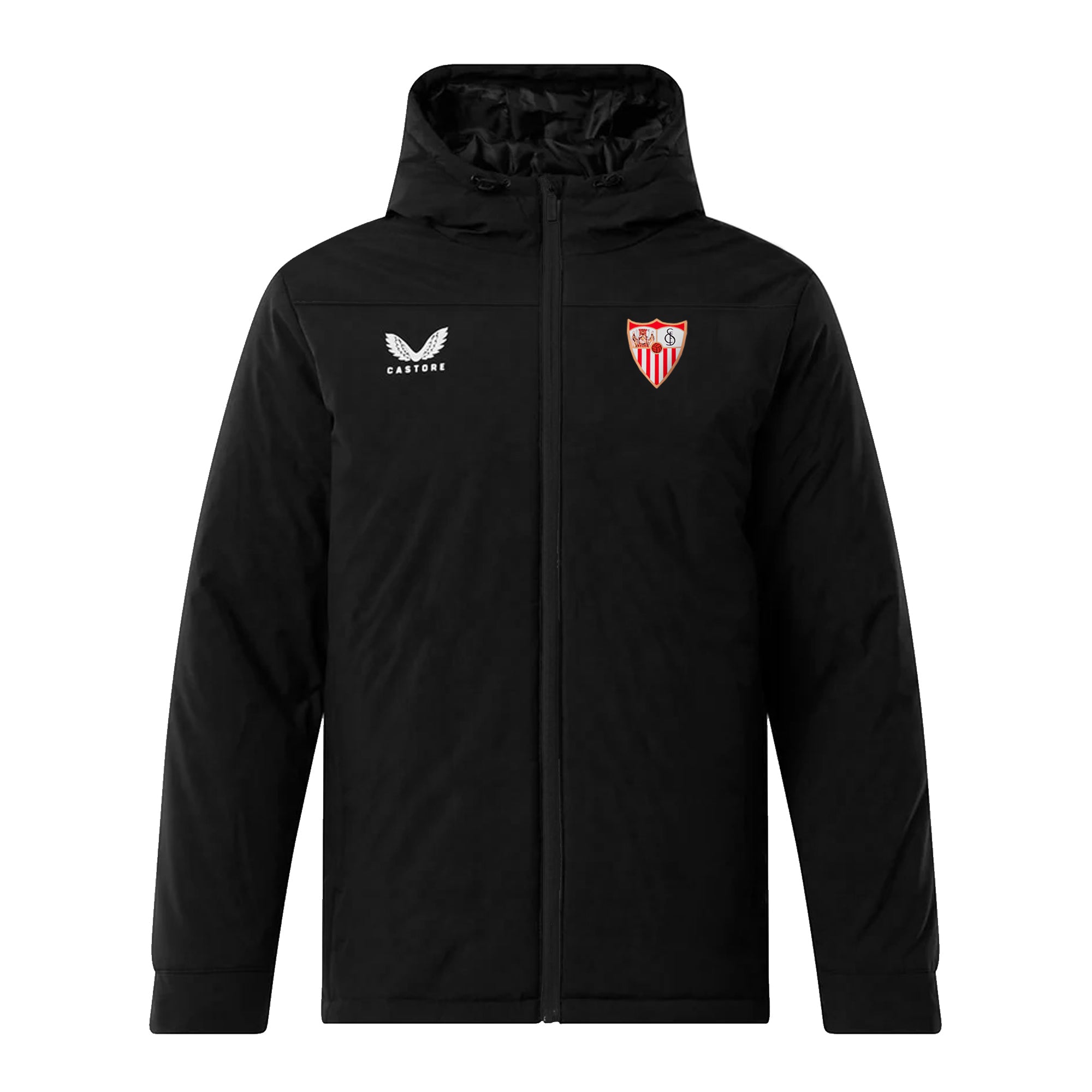 Anorak negro para niños con cuello alto, cremallera y escudo a todo color de la Colección de Entrenamiento de la temporada 23/24 del Sevilla FC.