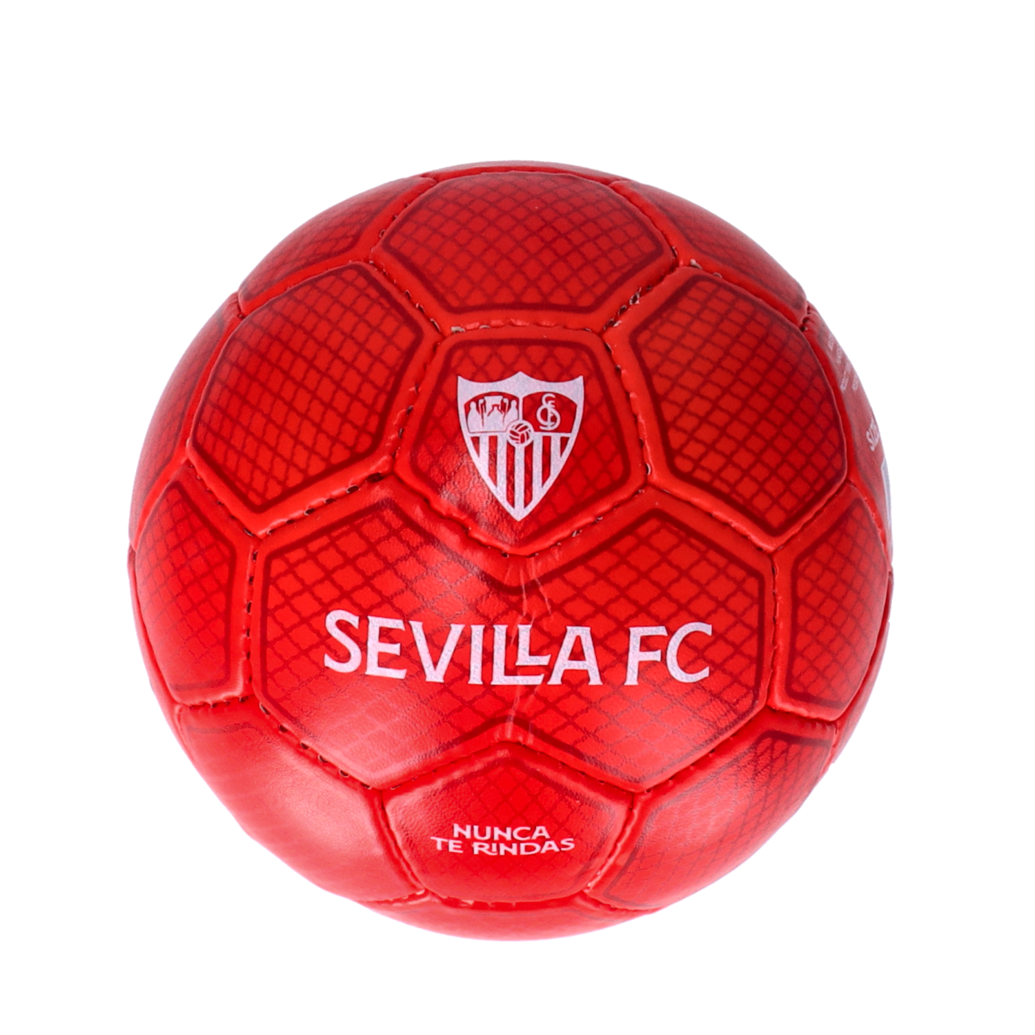 Balón rojo con escudo y eslogan del Sevilla FC en blanco. Balón de fútbol de tamaño mediano con un diámetro de 15 centímetros.