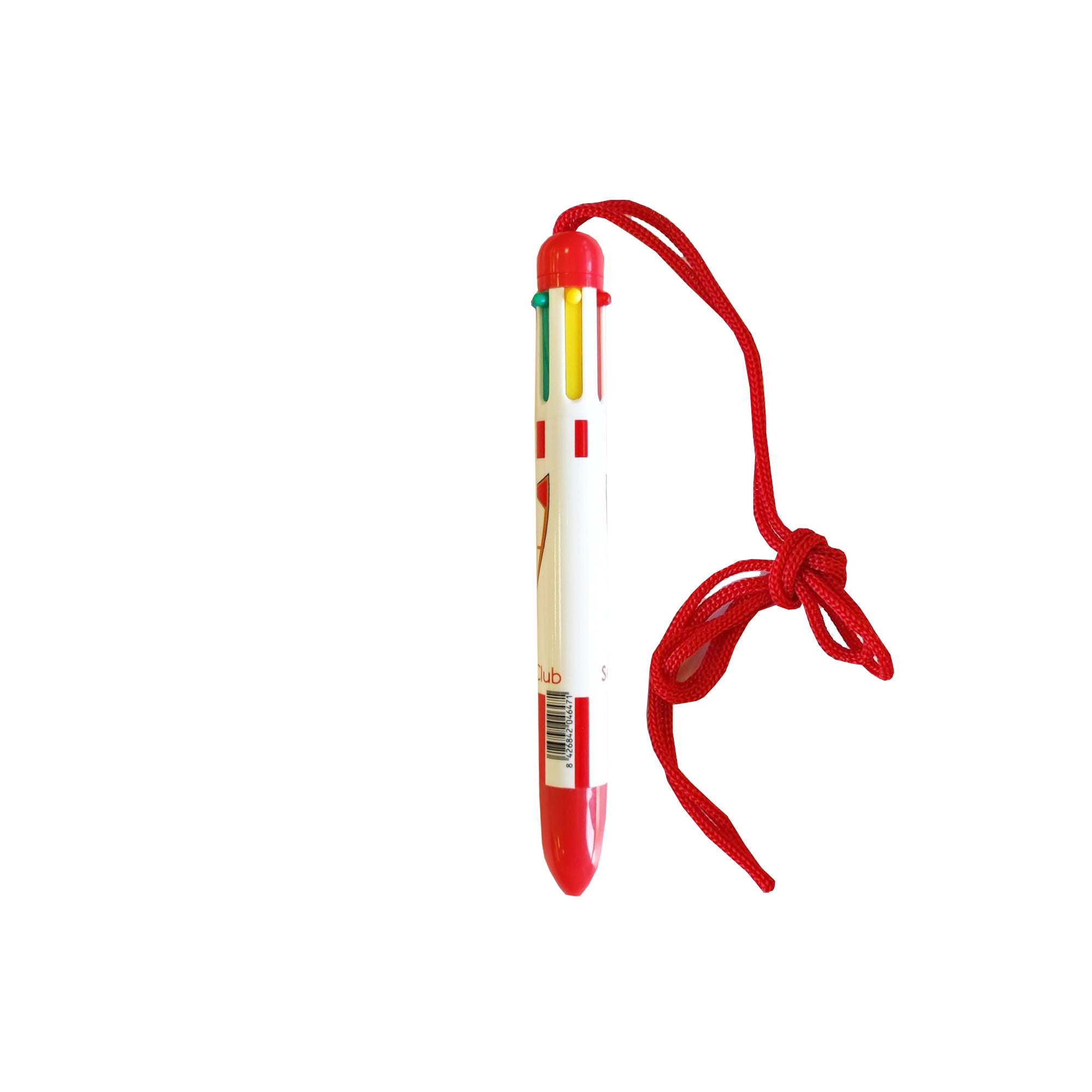 Bolígrafo 6 en 1 del Sevilla FC: Diseño retráctil de resorte lo que permite cambiar al color que quieras. Colores: azul, negro, rojo, amarillo,verde y morado. Trazado de líneas suave y sólido. Bolígrafo de punta media 0,5 mm con un trazo de escritura muy ligero. Dispone de una cuerda para llevar colgado