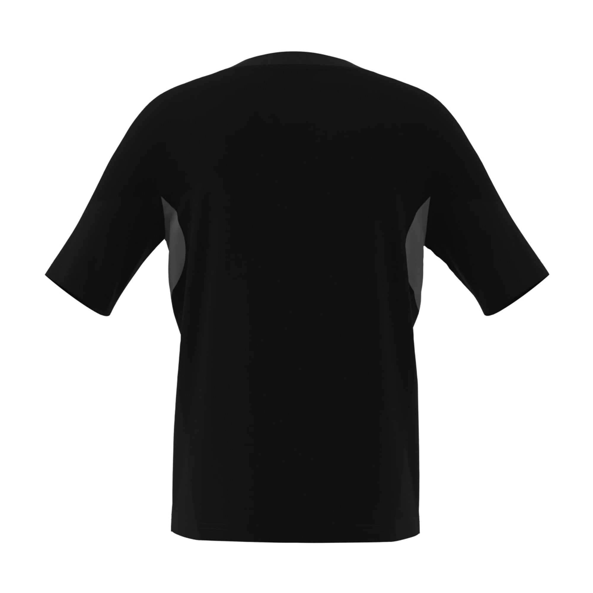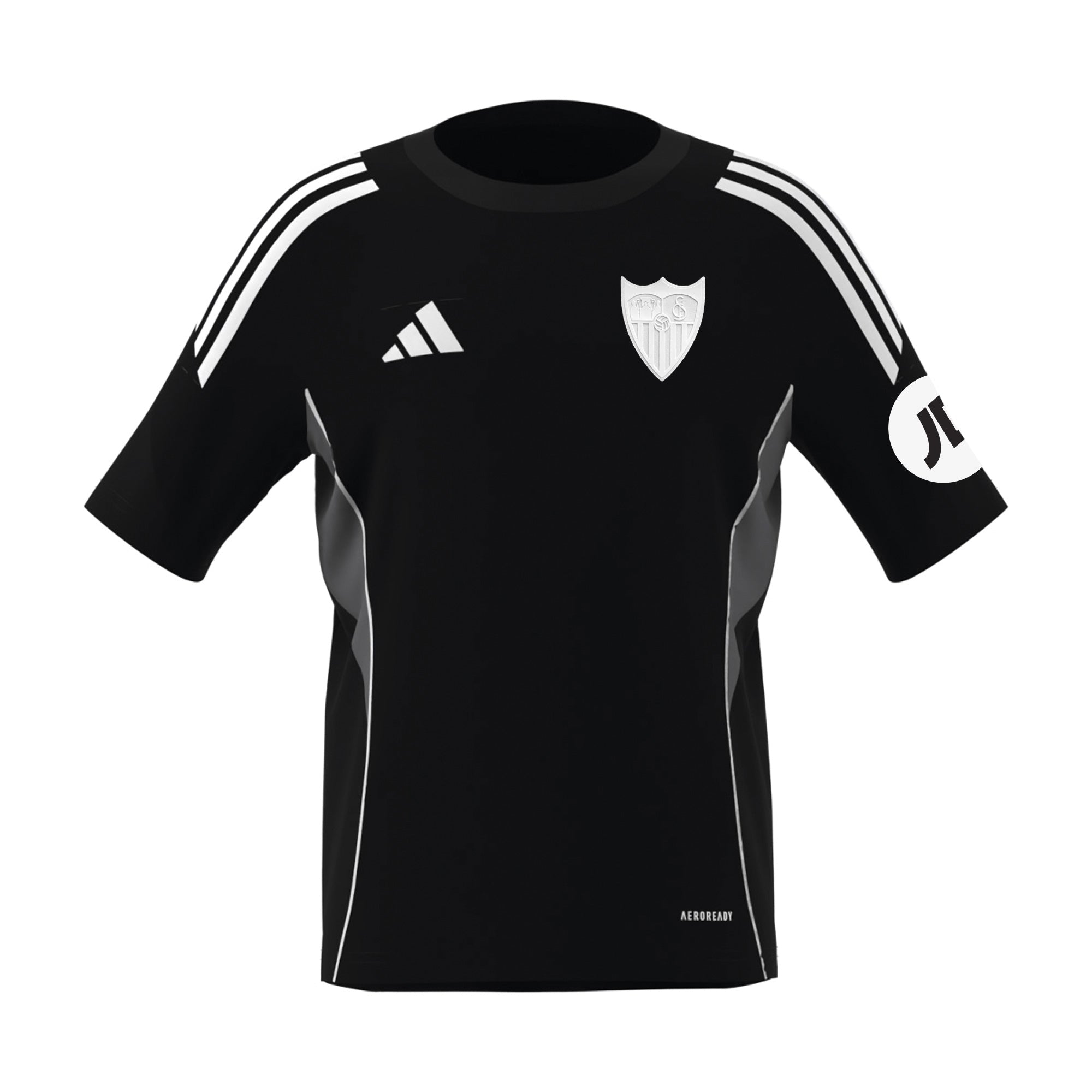 Camiseta negra de entrenamiento para adultos con detalles blancos laterales y en los hombros y el escudo del Sevilla FC en blanco en el pecho, perteneciente a la Colección Oficial de Entrenamiento del Sevilla Fútbol Club para la temporada 25/26.