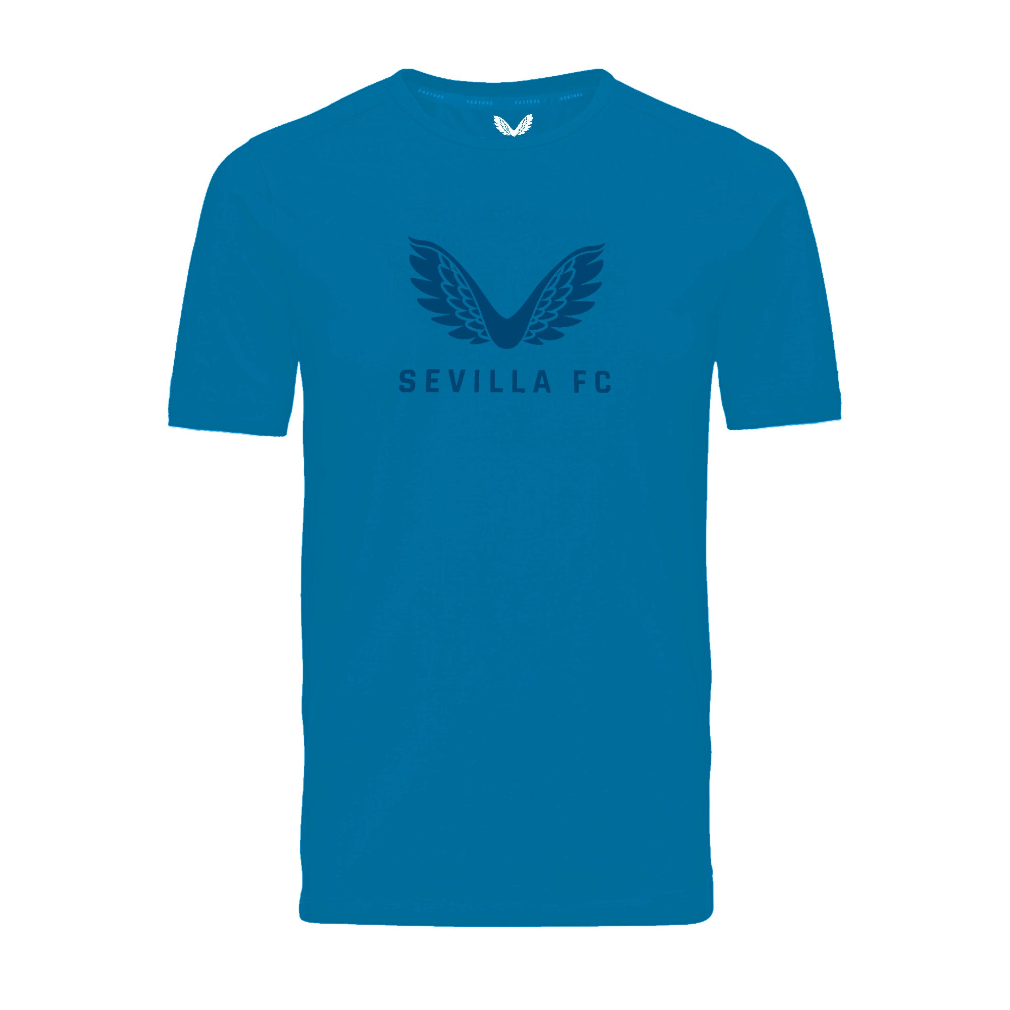 La camiseta imprescindible para niños de la Colección Oficial de Moda Casual del Sevilla Fútbol Club para la temporada 24/25, en color azul petróleo con el logo del sponsor técnico y el nombre de tu equipo serigrafiados en gran tamaño y en color naranja en el pecho. Perfecta para cualquier ocasión.