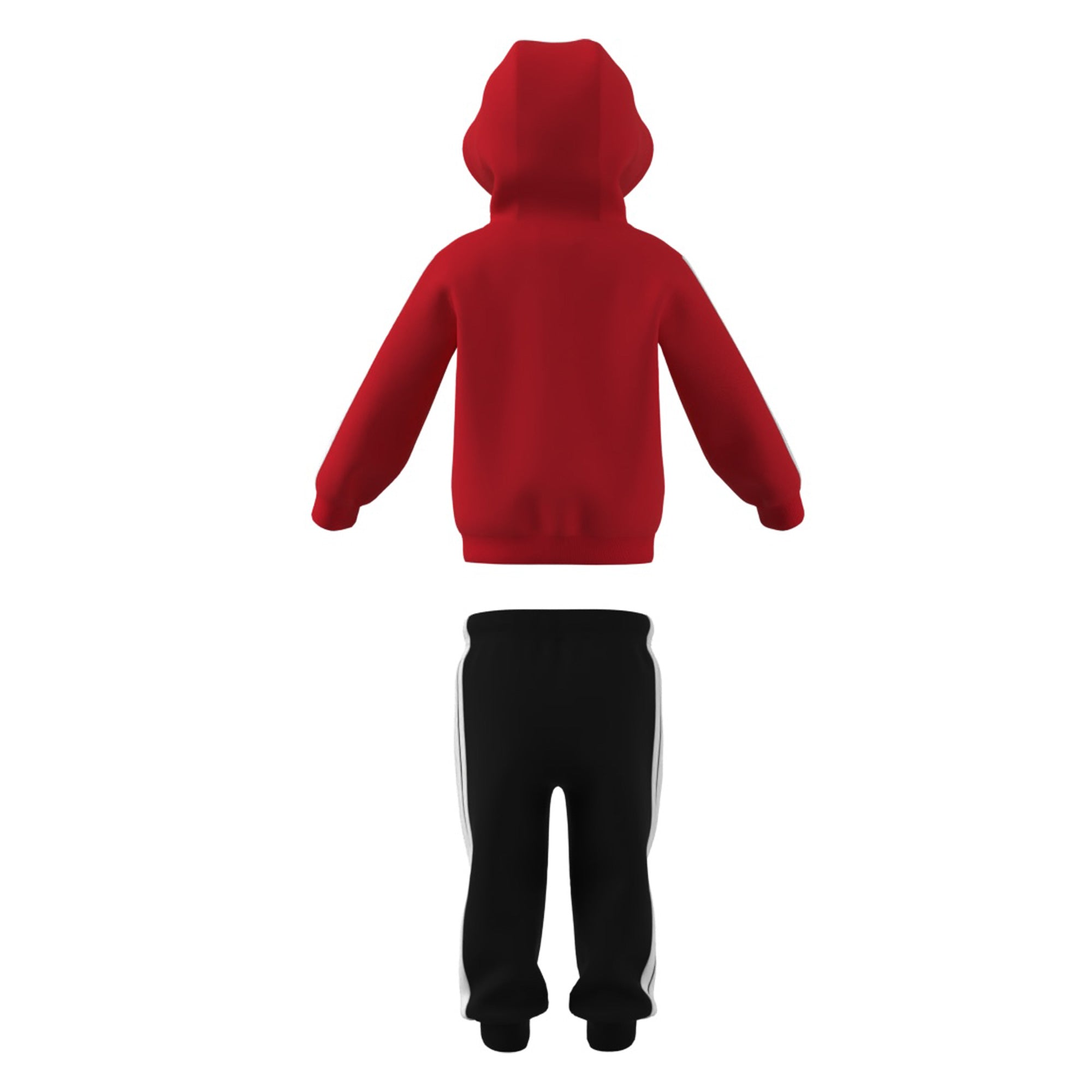 Sudadera roja con capucha y cremallera, con detalles blancos en las mangas, pantalón negro con detalles blancos laterales.