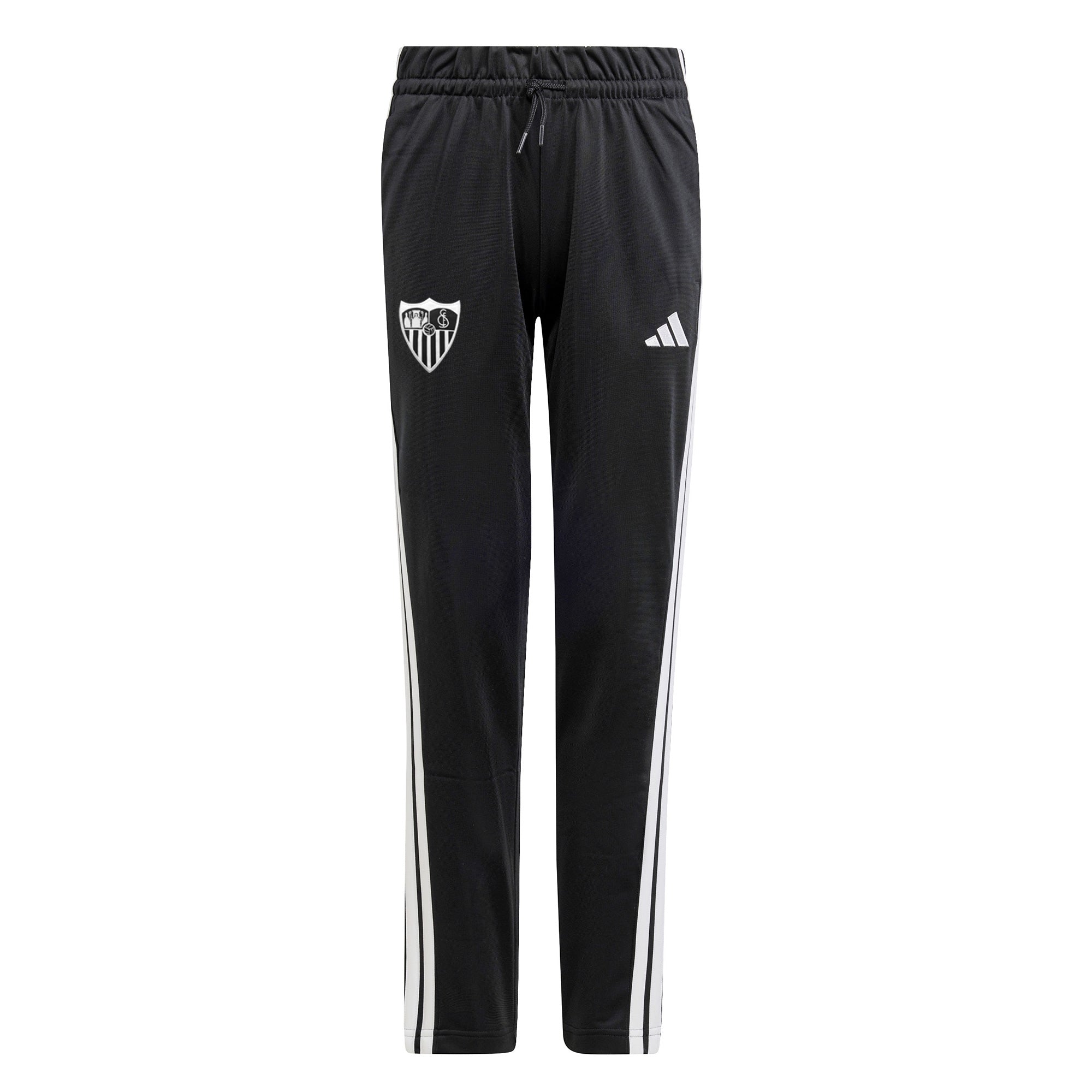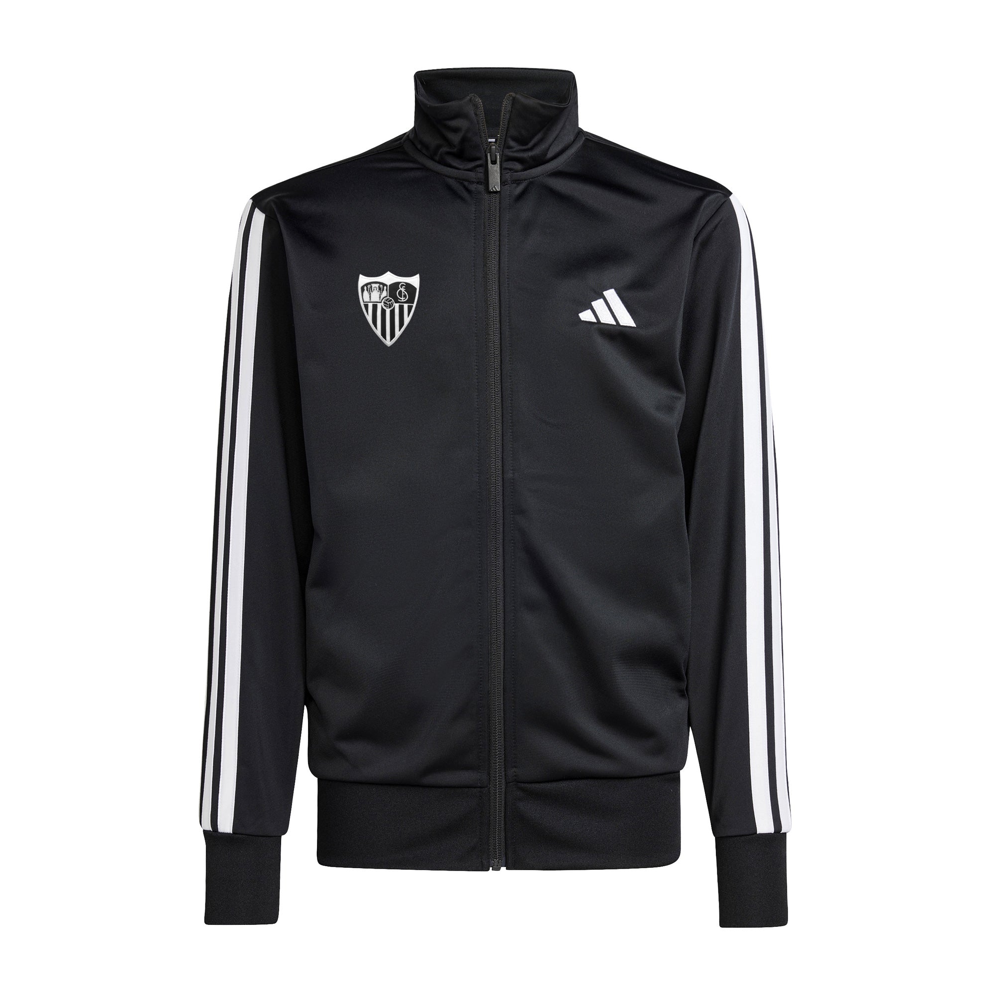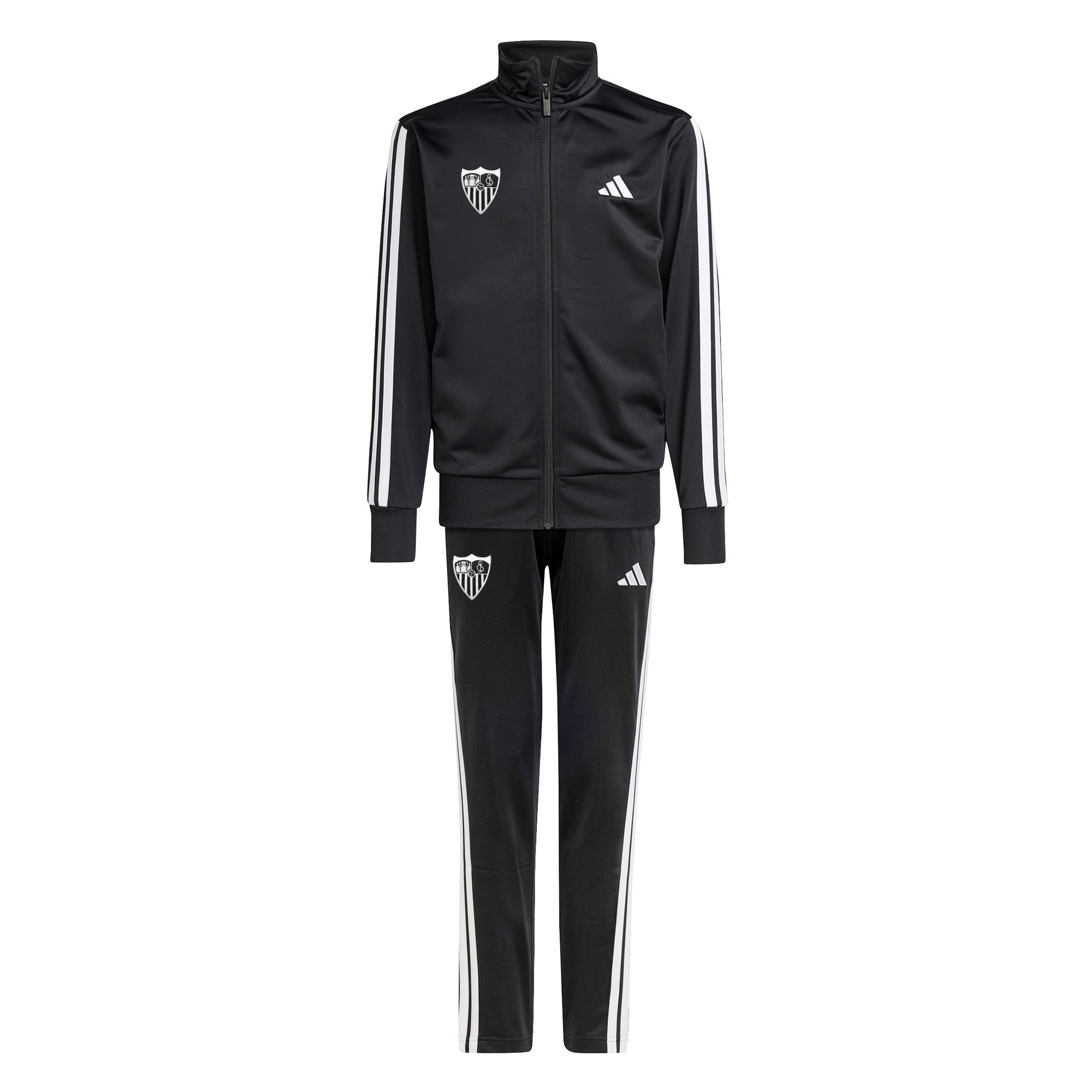 El chándal de niño de la temporada 25/26 , chaqueta negra con detalles en las mangas y escudo en color blanco y pantalón negro con detalles laterales de color blanco.
