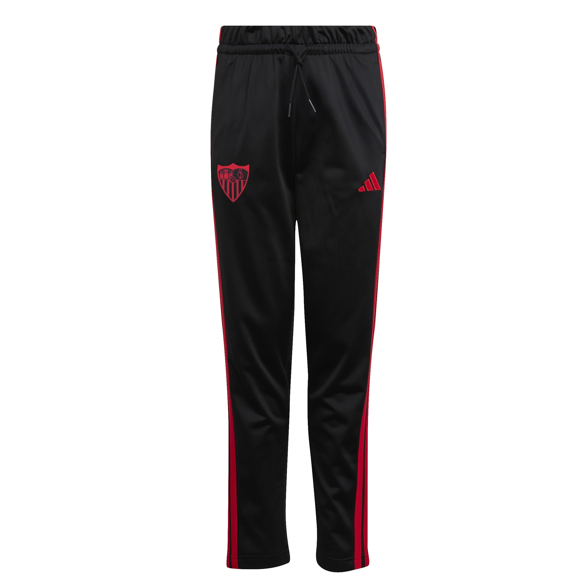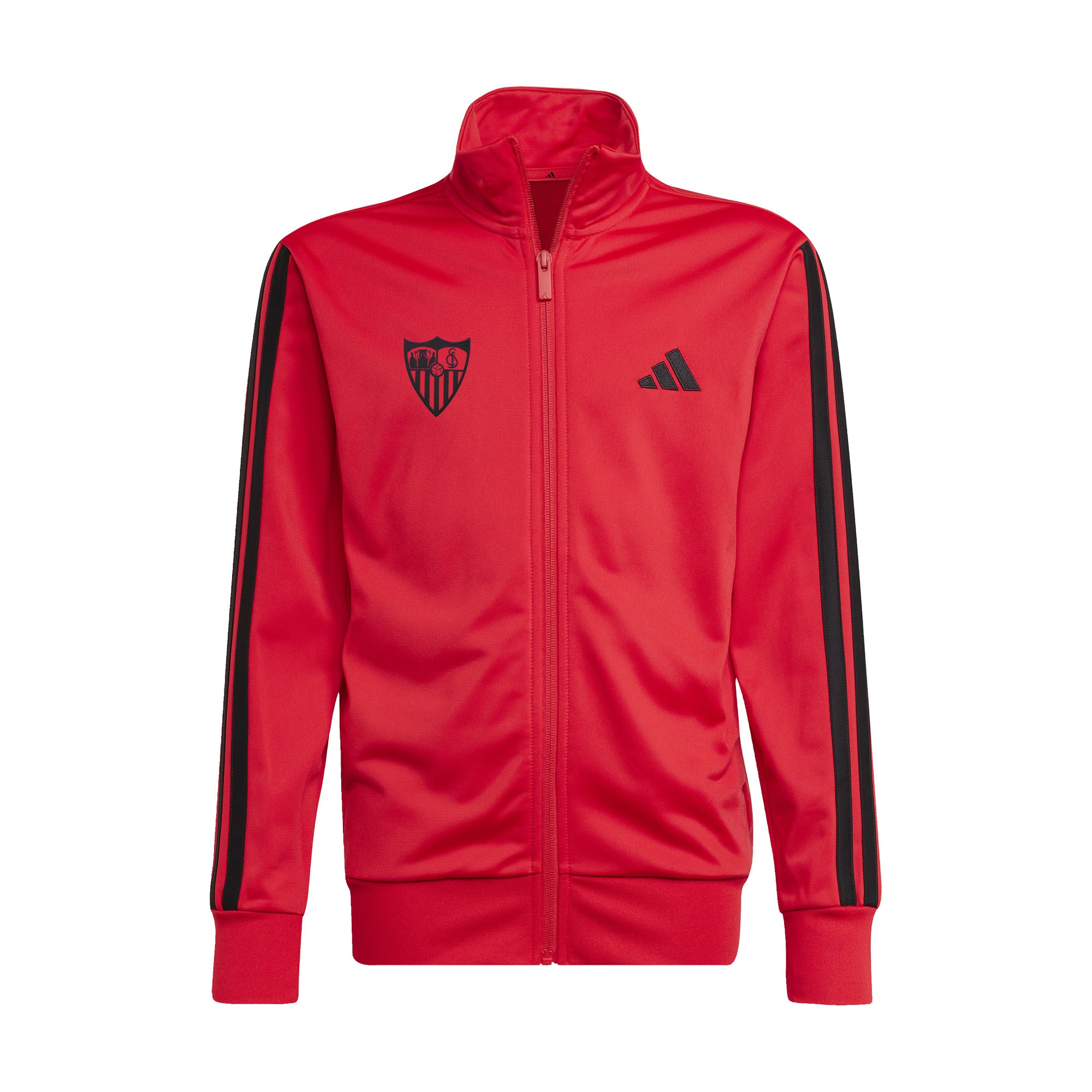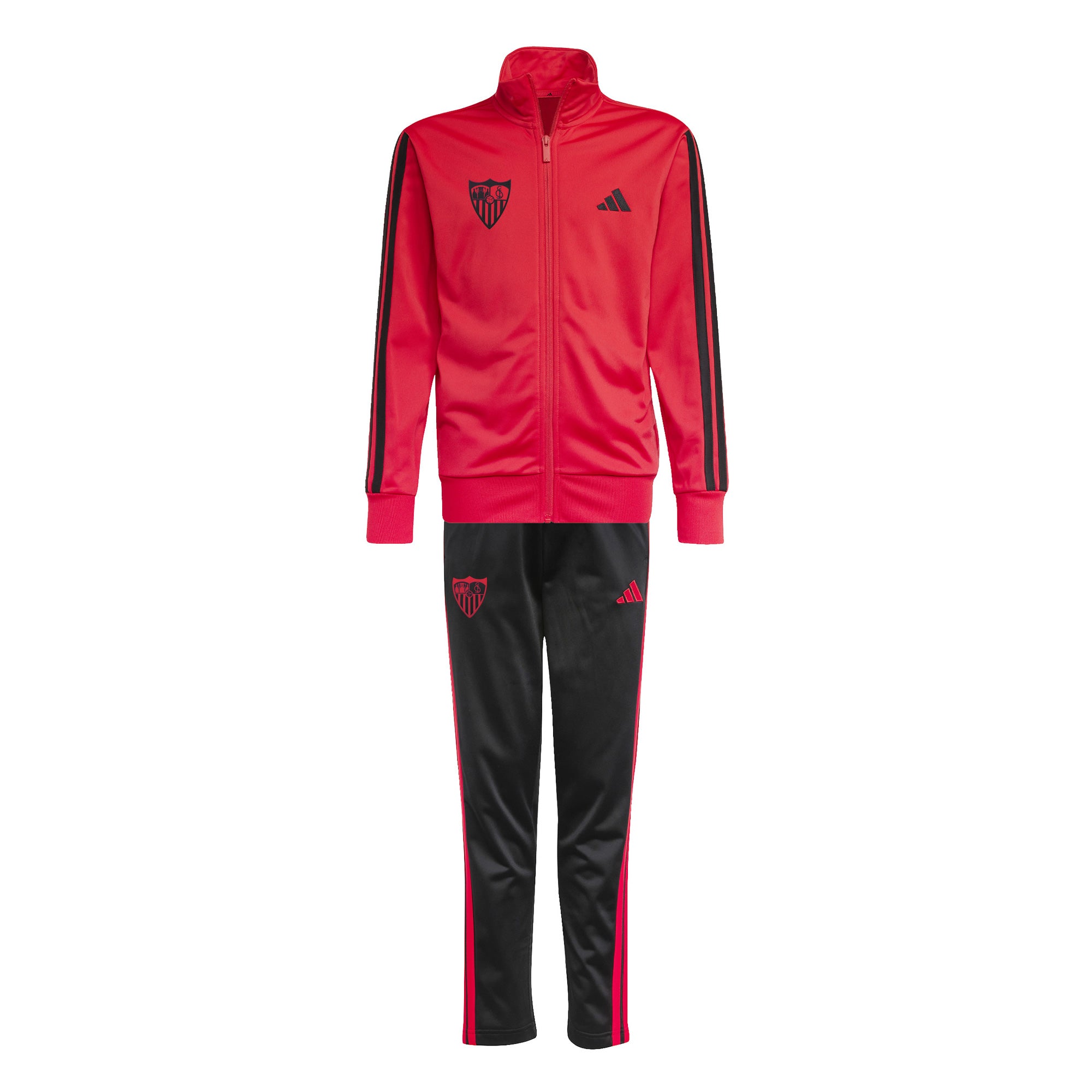 El chándal de niño de la temporada 25/26 , chaqueta roja con detalles en las mangas y escudo en color negro y pantalón negro con detalles laterales de color rojo.