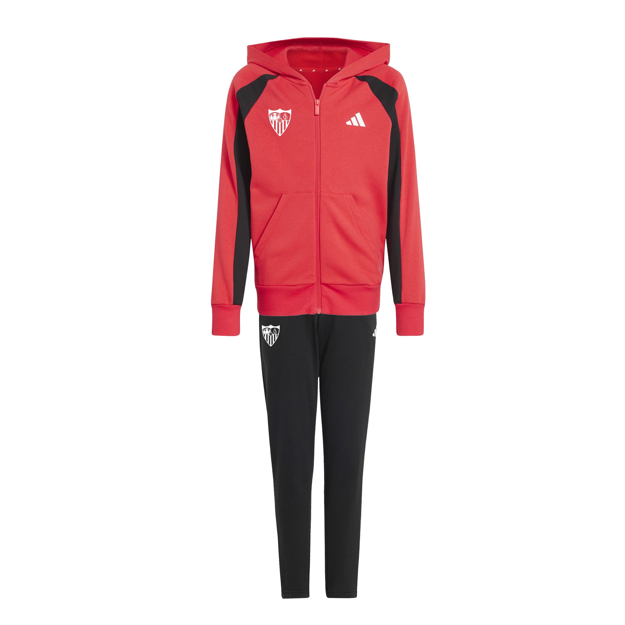 El chándal de niño de la temporada 25/26 , chaqueta roja con cierre de cremallera y capucha, pantalón negro con sponsor y escudo en blanco.