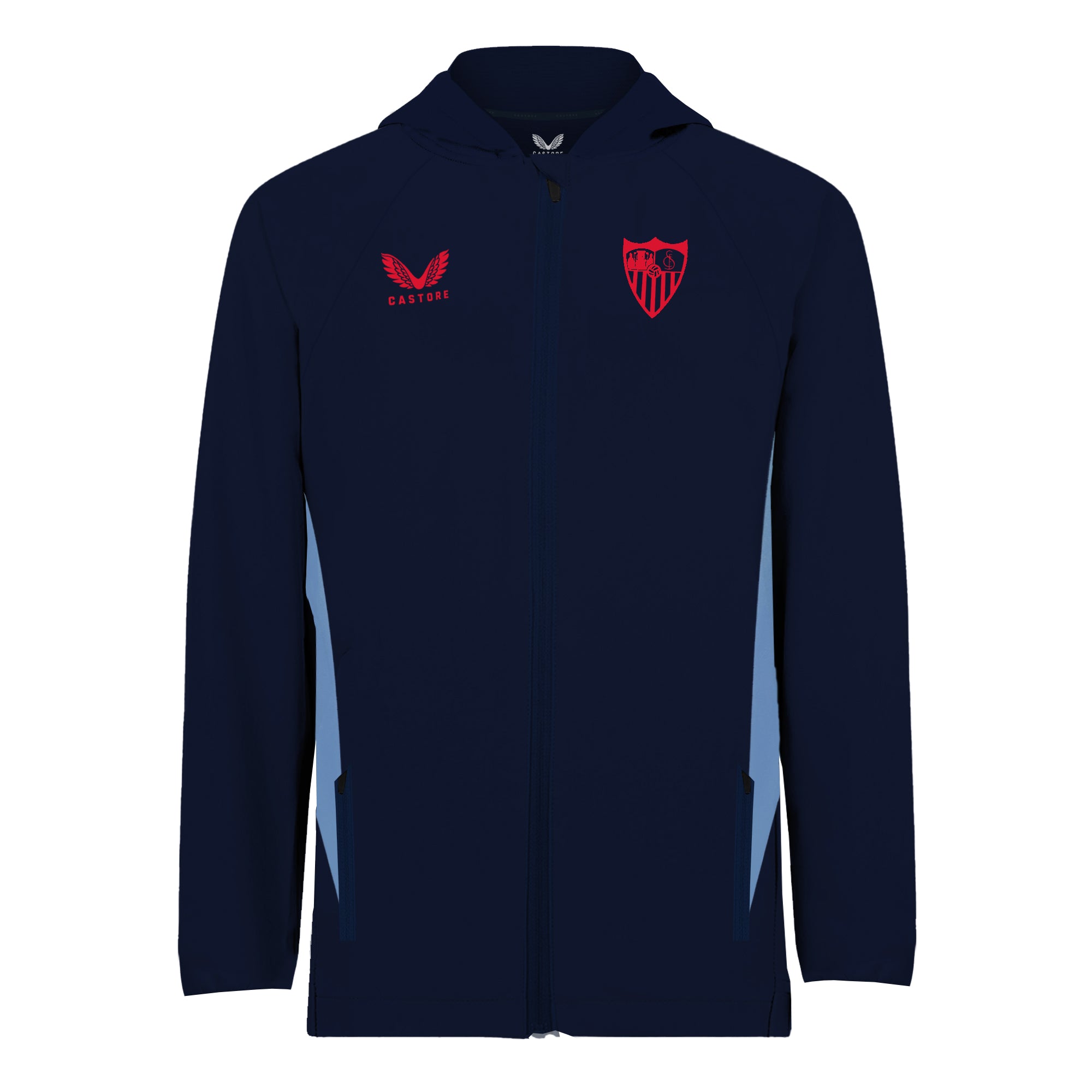 Chaqueta de chándal azul para mujer de la Colección Oficial de Entrenamiento del Sevilla Fútbol Club para la temporada 24/25. Con cremallera central y el escudo del equipo y el logo del patrocinador técnico serigrafiados en naranja en el pecho.