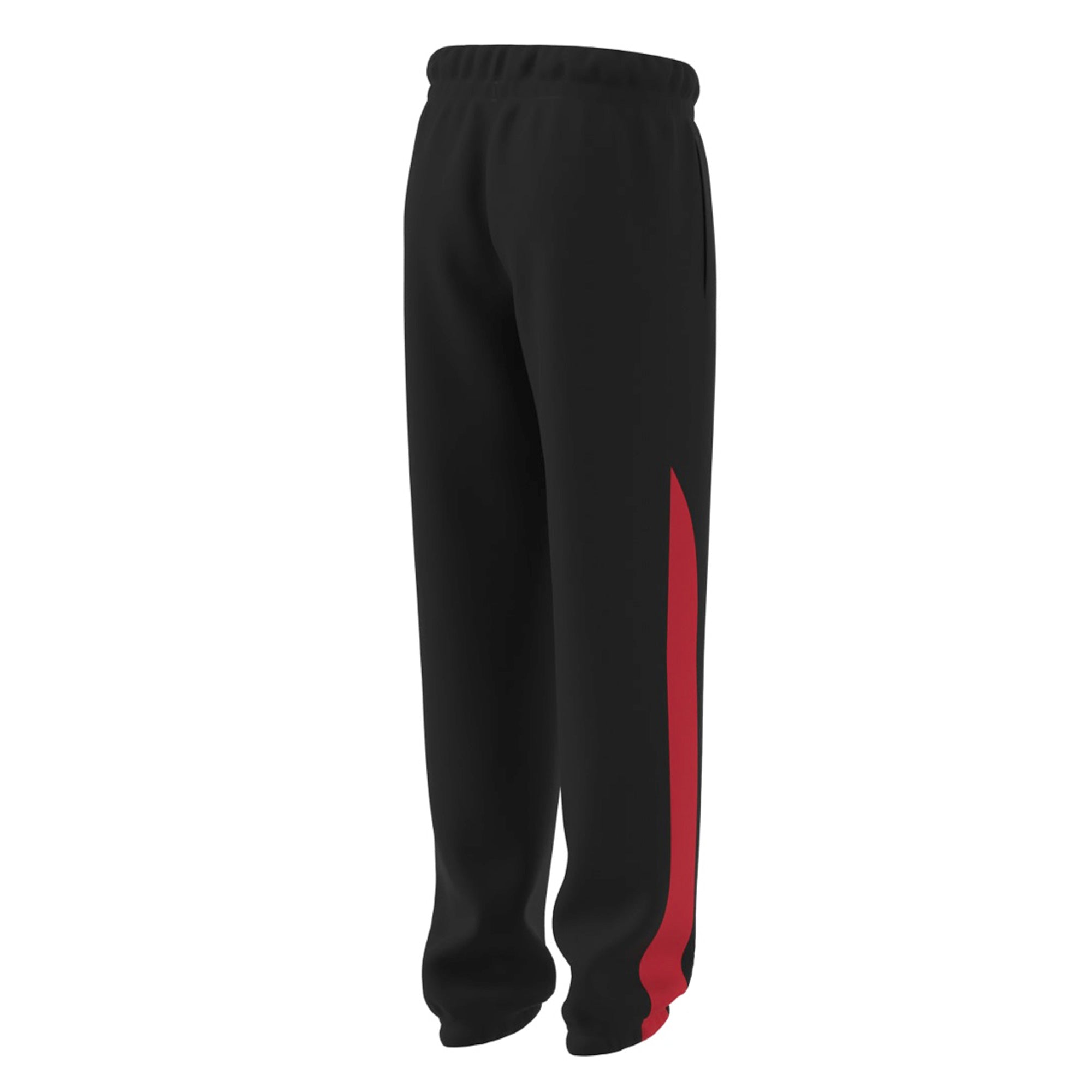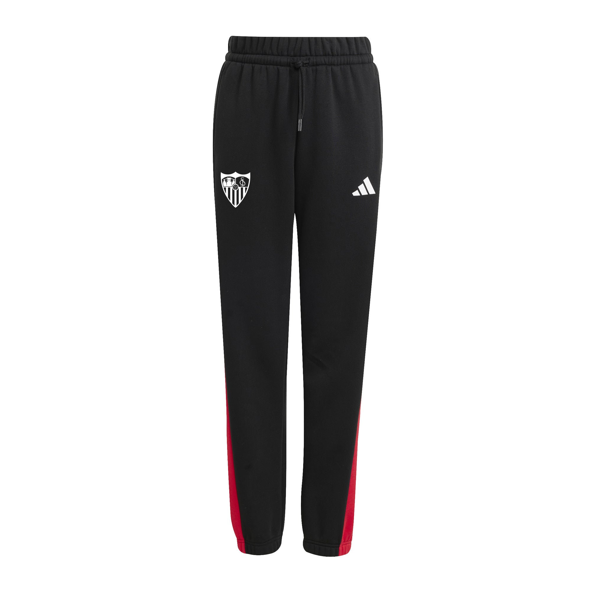 Perteneciente a la Colección Oficial del Sevilla Fútbol Club para la temporada 25/26, este pantalón negro de chándal para niños, detalles en rojo y el logo del sponsor técnico y escudo del Club serigrafiados en rojo.