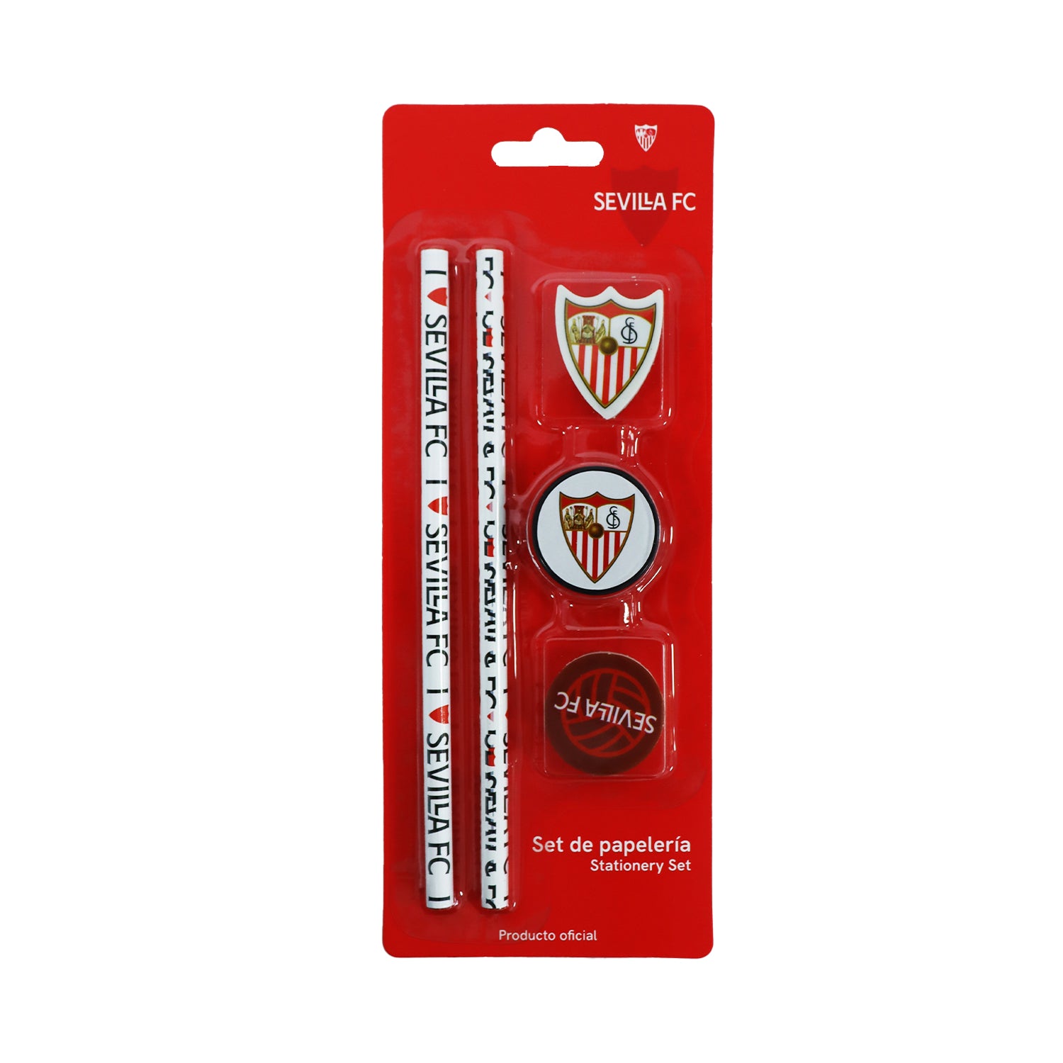 Set de papelería del Sevilla FC que contiene 2 lápices, 2 gomas y 1 sacapuntas.
