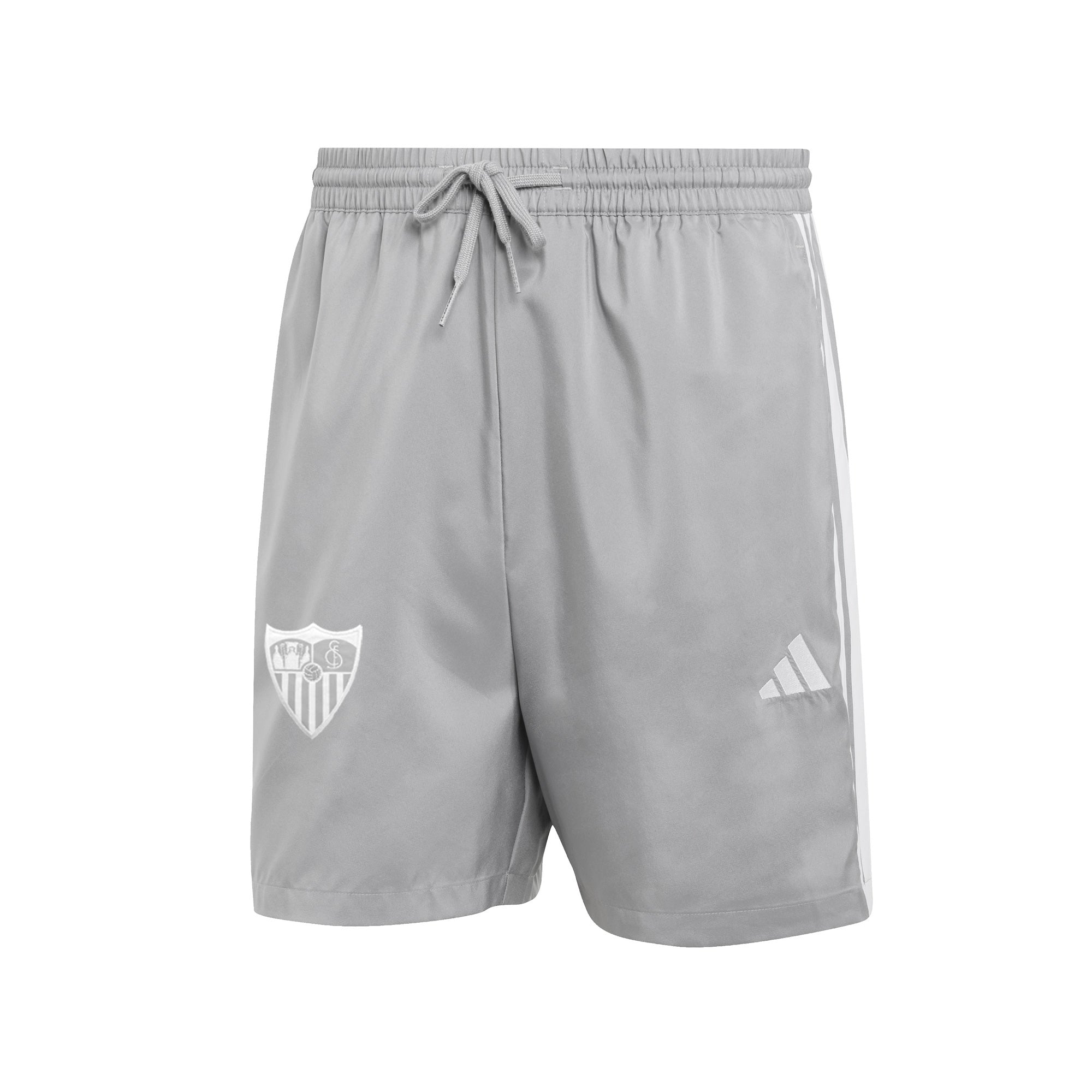 Descubre nuestro bermuda para adultos, en color gris, con rayas laterales y el imponente escudo del Sevilla FC en color blanco. Oficiales de la temporada 25/26.
