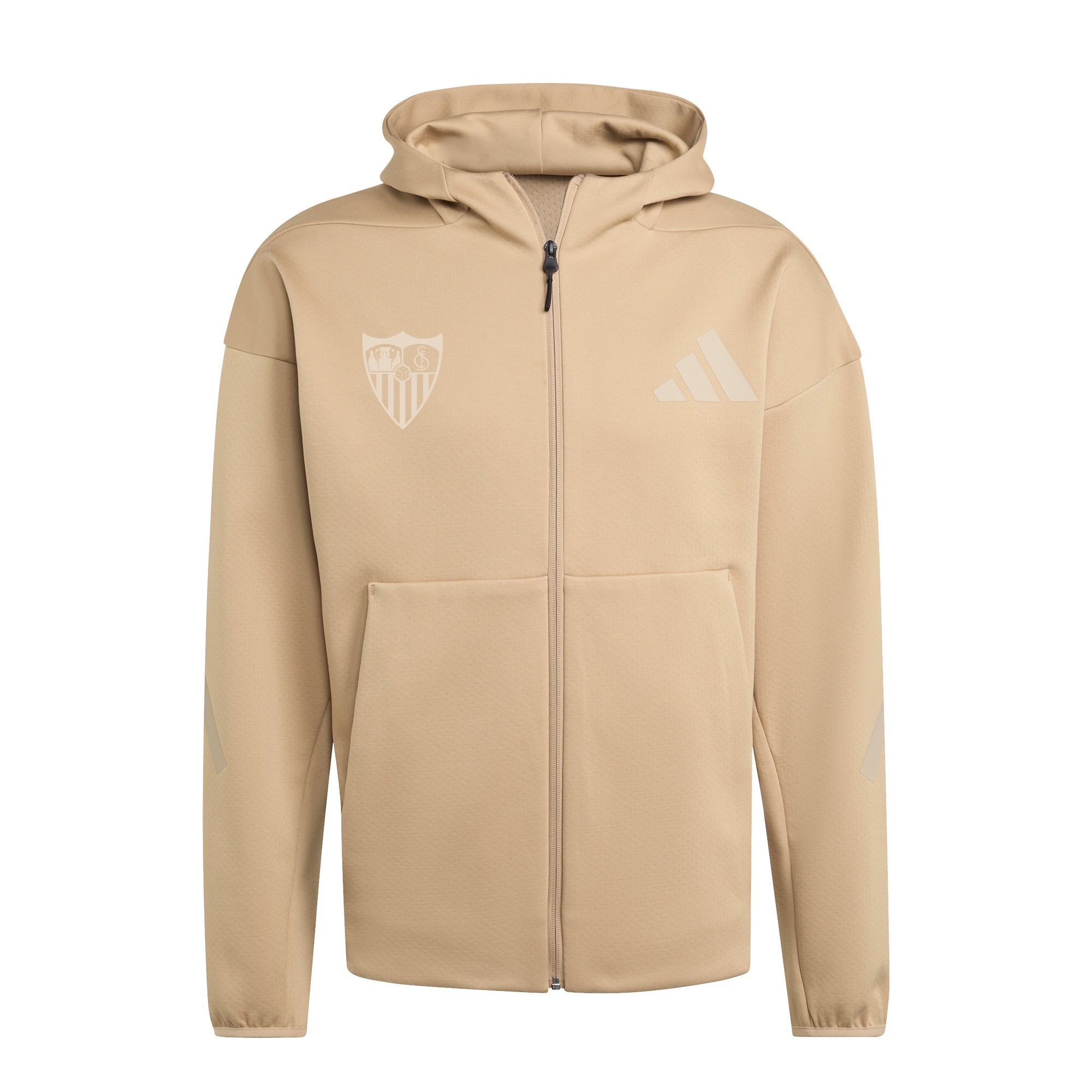 La sudadera beige para adultos, chaqueta con capucha y cremallera completa , de la Colección Oficial del Sevilla Fútbol Club para la temporada 25/26.