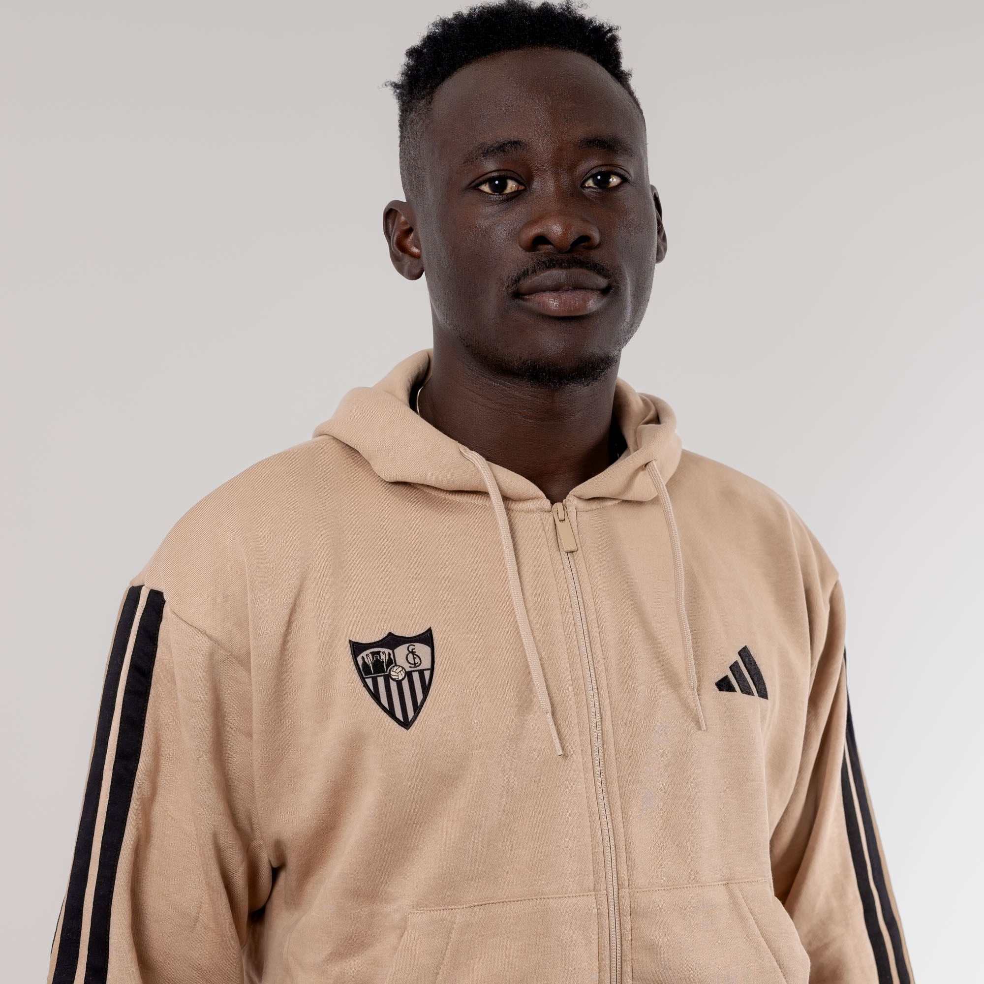La sudadera beige para adultos, con capucha y bolsillos de canguro de la Colección Oficial del Sevilla Fútbol Club para la temporada 25/26. Lúcela en ocasiones casual con su elegante diseño con detalles laterales, sponsor técnico y escudo serigrafiados en negro en el pecho.
