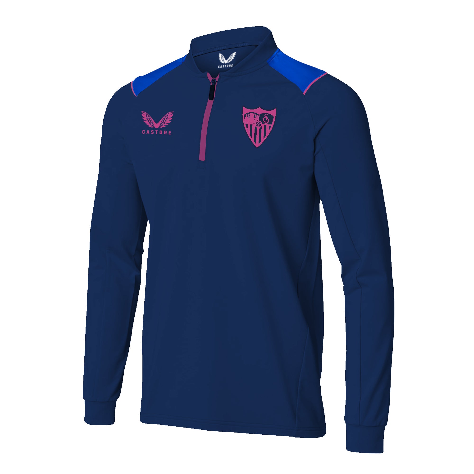 Vive el fútbol con estilo con esta sudadera azul con media cremallera en el cuello y escudo del Sevilla FC fucsia. Diseño oficial para mujeres de la temporada 22/23 con corte ajustado para mayor comodidad en tus entrenamientos.