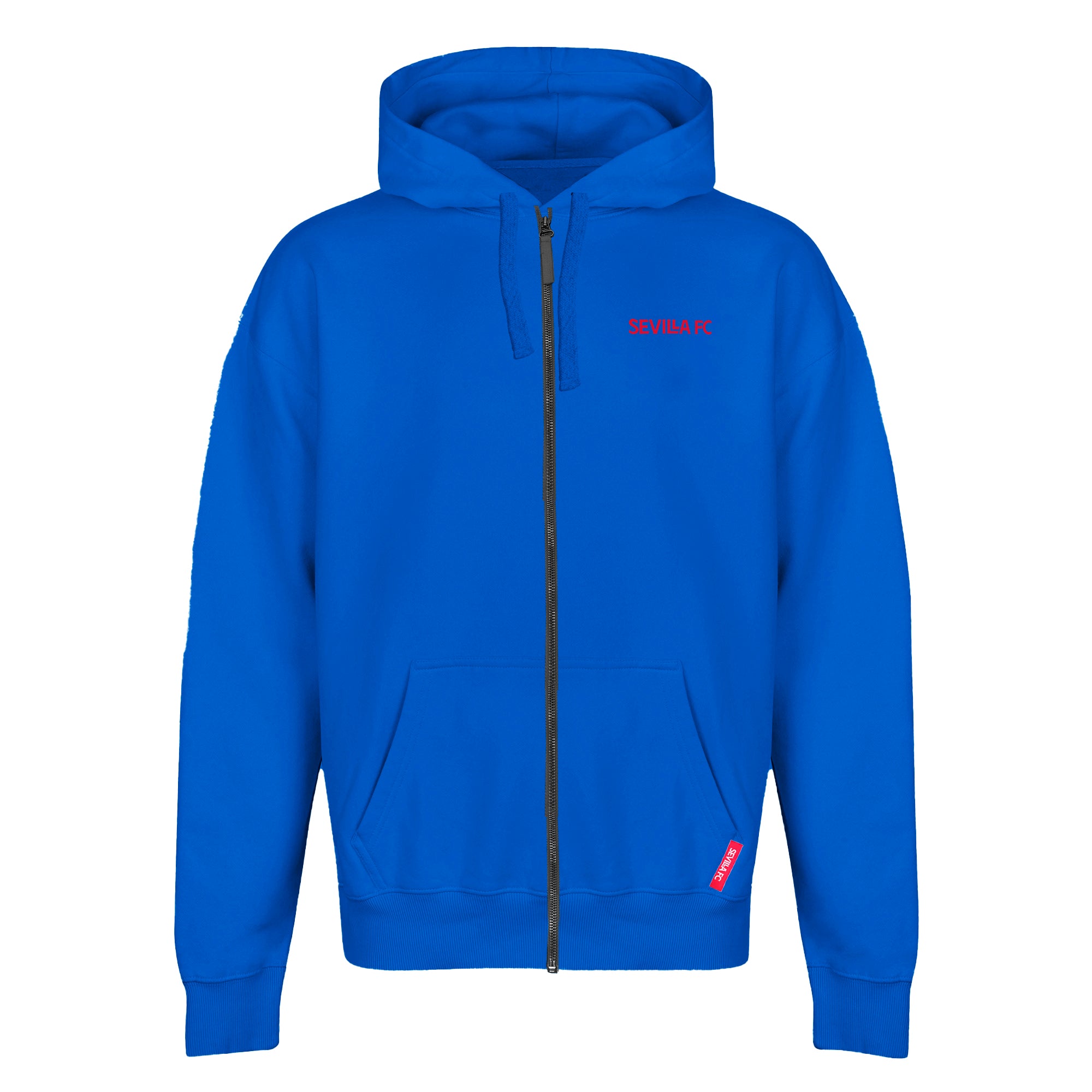 Una sudadera básica azul con cremallera, capucha y con el emblema del Sevilla FC en un lateral en rojo con la tipografía del Club. Perteneciente a la Colección de Moda Casual 24/25, se trata de una sudadera de vestir que no puede faltar en tu armario sevillista.